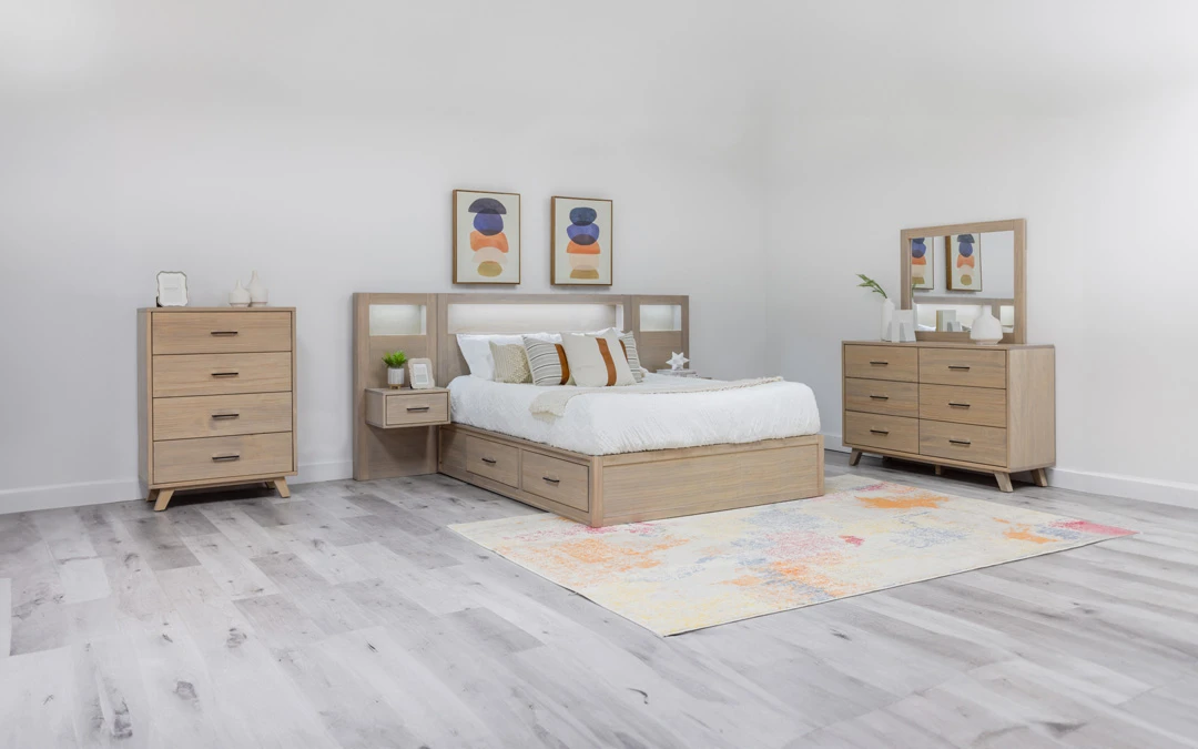 Belmont Bedroom Suite contains a Side storage or Lift top-storage bed in any size of your choice with Floating nightstand On Headboard, a 6 drawers or 9 Drawer dresser and a mirror. Made of solid pine wood. Made in BC, Canada.