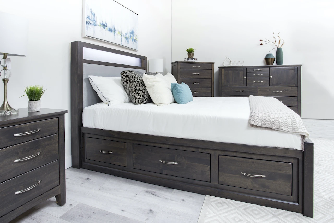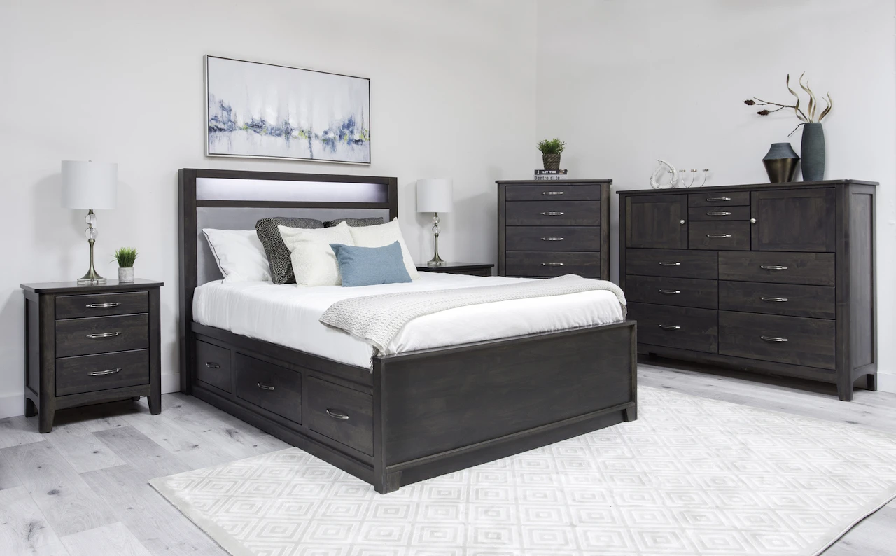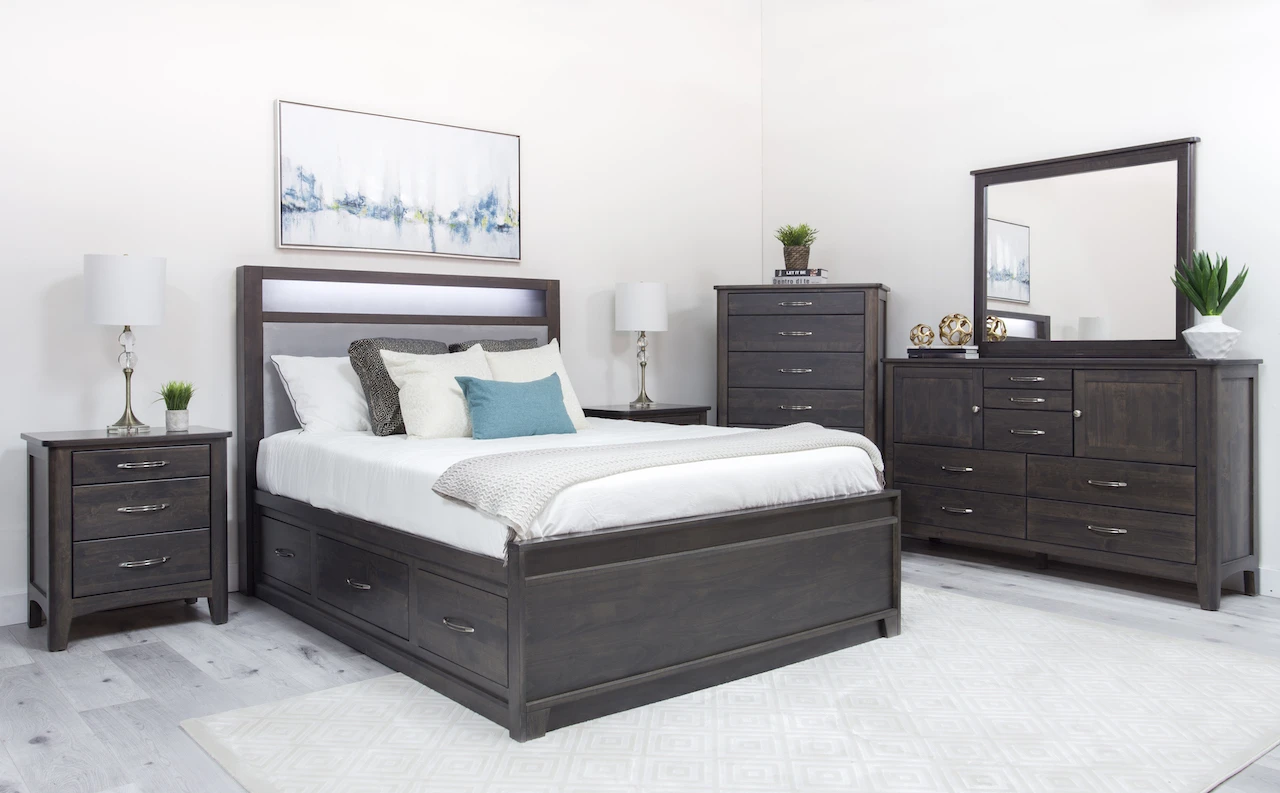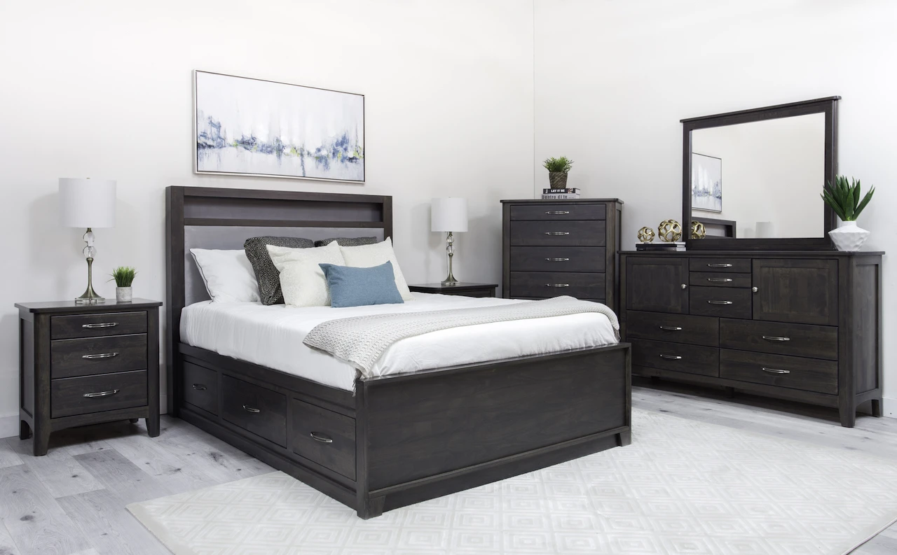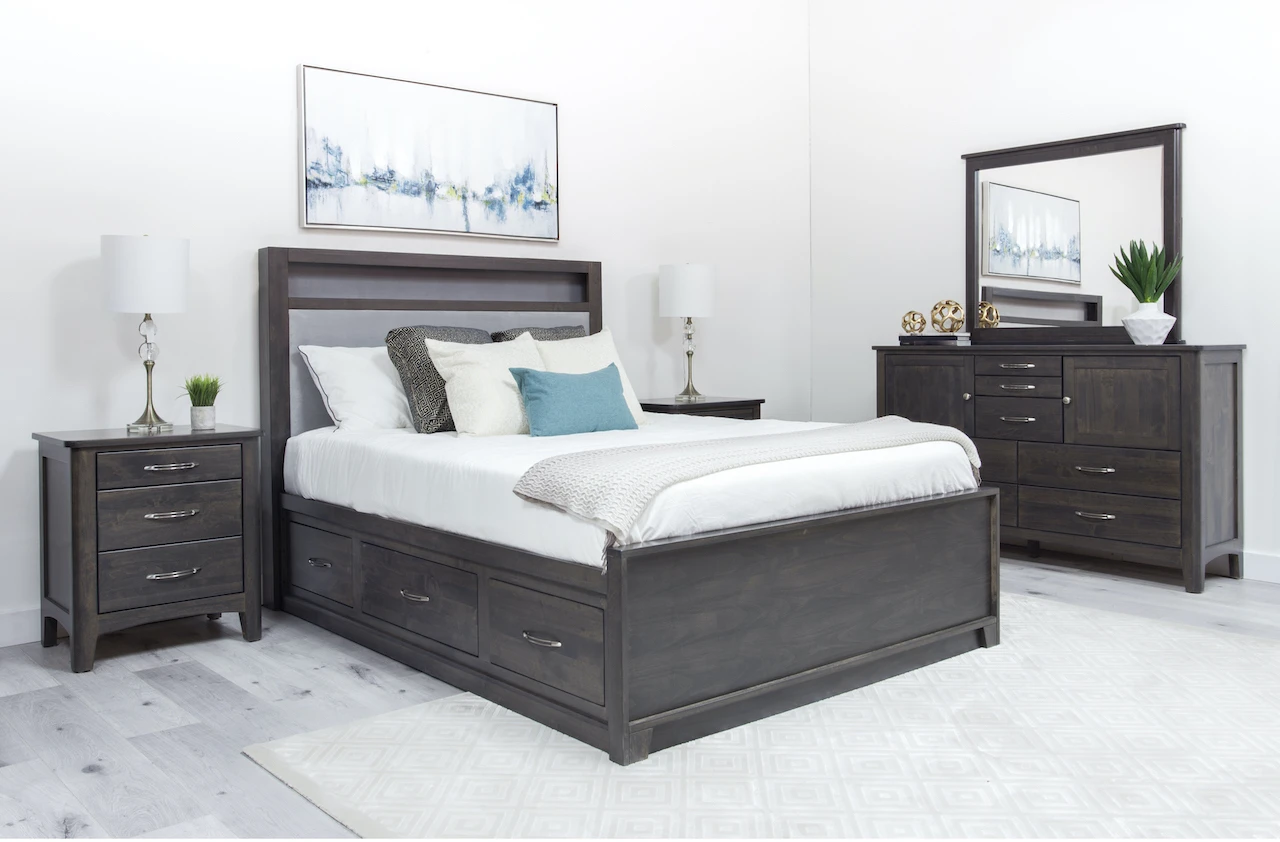 York Bedroom Suite contains a storage or non-storage bed in any size of your choice with a nightstand, a dresser and a mirror.